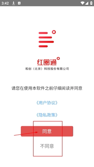 1、仔细阅读【红圈通】的《用户协议》与《隐私政策》,确认无误后点击【同意】按钮,即可进入应用的功能选择界面。