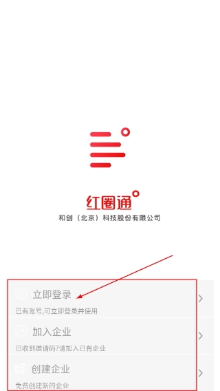 2、进入红圈通页面后,你可以选择【立即登录】来使用已有的账号,也可以选择【加入企业】或者【创建企业】进行相应的操作。
