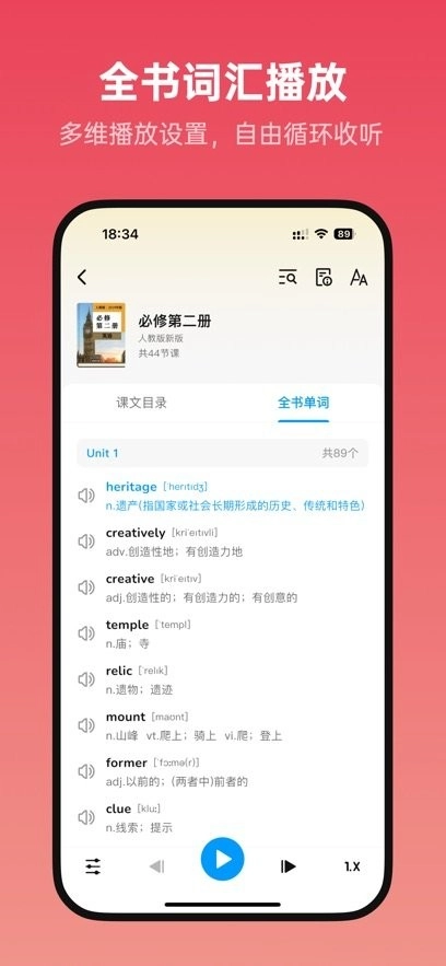 支持自定义调节播放语速,还提供多种播放模式;能适配不同学习习惯,支持整书单词播放功能,方便用户随时随地进行听力训练。