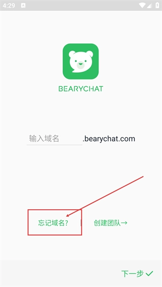 1、在【BEARYCHAT】的域名输入页面,要填写相应的域名(后缀是【.bearychat.com】),要是记不清域名了,可以点击【忘记域名?】这个选项。