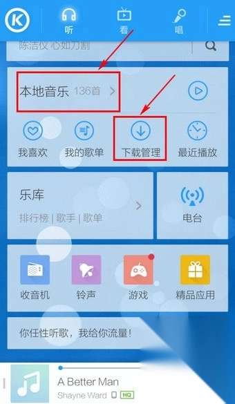 1、打开酷狗铃声,在【本地音乐】或者【管理】页面找到已有的歌曲