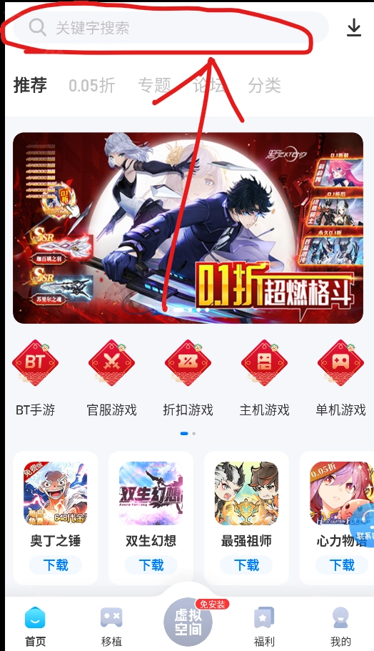 4、要是清楚自己想玩哪款游戏,直接在首页点击顶部的搜索框进行搜索就可以了。