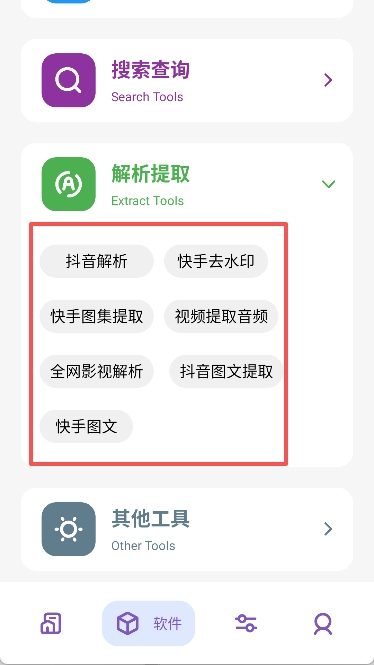 2、涵盖日常生活、综合工具、搜索查询、解析提取等各类功能。