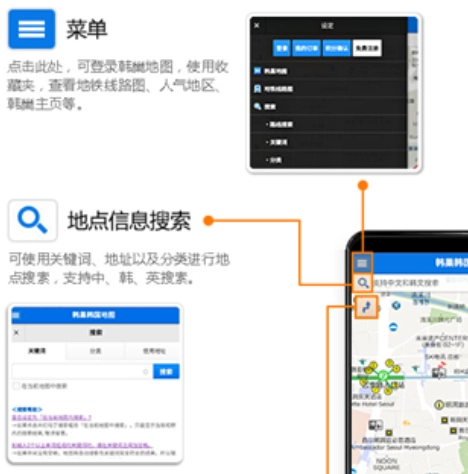 1. 点击“菜单”,能登录韩国地图,使用收藏夹功能,查看地铁路线图、人气地区等内容;点击“地点信息搜索”,则可以通过关键词、地址以及分类的方式来搜索地点。