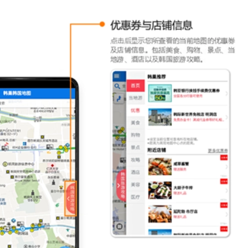 3. 点击“优惠券与店铺信息”,点击后将展示您当前查看地图对应的优惠券及店铺信息,涵盖美食、购物、景点、当地游、酒店以及韩国旅游攻略等内容。