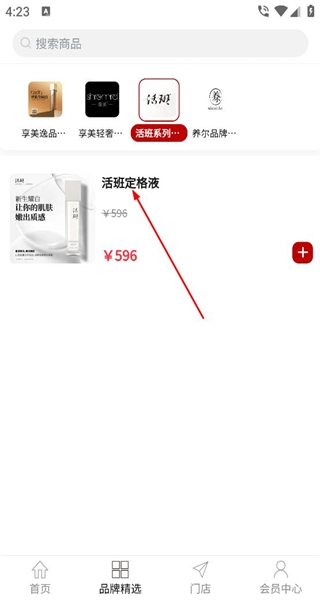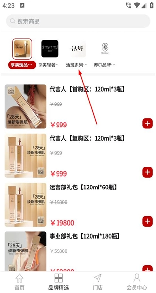 2、点击“品牌精选”后,会呈现各类不同的分类标签,选择对应的分类标签,即可展示出该分类下的全部商品,并且每件商品的旁边都设有购买按钮。