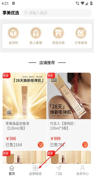 进入享美优选首页后,能看到会员码、新人套餐等功能入口,同时设有店铺推荐板块,该板块展示了多款美妆商品,并标注了对应的价格和销量信息。