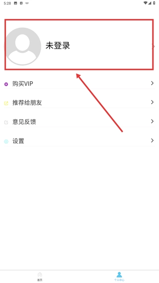 2、进入【个人中心】后,点击【未登录】区域,既能进入登录流程,也可操作【购买VIP】【推荐给朋友】等功能。