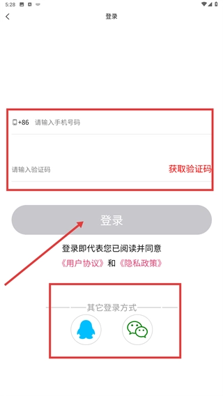 3、进入【登录】页面后,可通过两种方式完成账号验证:一是输入【手机号码】,点击【获取验证码】并填写收到的验证码;二是选择【QQ】【微信】等第三方登录方式。