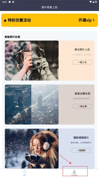 1、进入【照片修复上色】的首页后,能看到【黑白照片上色】【图像去雾处理】等功能选项,点击对应的操作按钮(例如一键上色)即可开启处理流程。