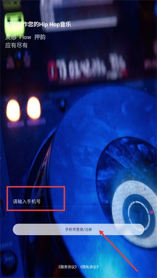 在韵律应用的登录界面,首先需在输入框中填写【手机号】,接着点击【手机号登录/注册】按钮,通过账号验证后即可进入应用。