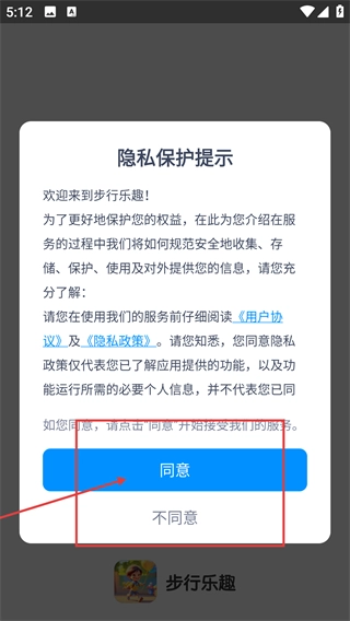 1、在隐私保护提示弹窗里,点击【同意】按钮,完成对《用户协议》和《隐私政策》的确认,即可进入“步行乐趣”的功能页面。