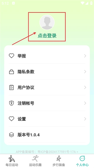 2、进入每日运动页面后,点击底部导航栏中的【个人中心】选项,即可进入个人相关功能的管理页面。