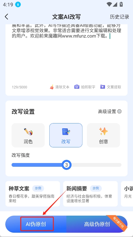 2. 选择完毕后,点击进入,将需要改写的内容复制进去,并点击“ai伪原创”按钮。
