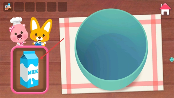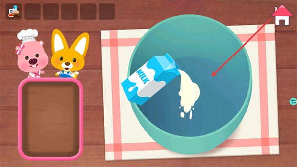 4、把已选中的食材(牛奶)倒进制作容器里,以此完成该食材的添加环节,推动烹饪流程向前进行。