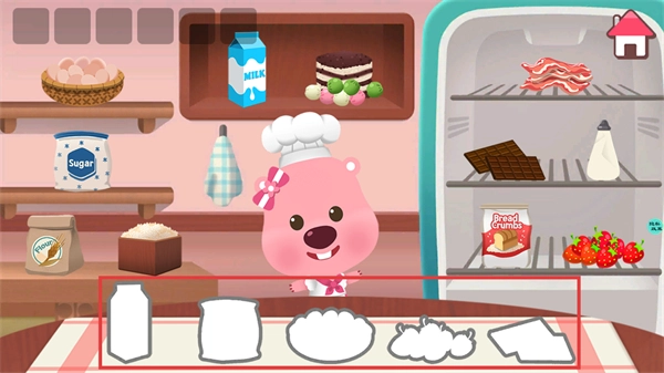 2、在食材储备界面查看所需食材的轮廓提示,然后从货架或冰箱里找出对应的食材(比如牛奶)。