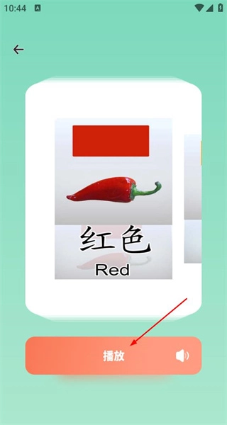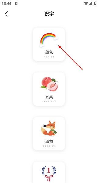 3、进入识字内容选择页面后,可以看到包含颜色、水果等类别的分类选项,点击选择对应的分类,就能进入该分类的学习页面。