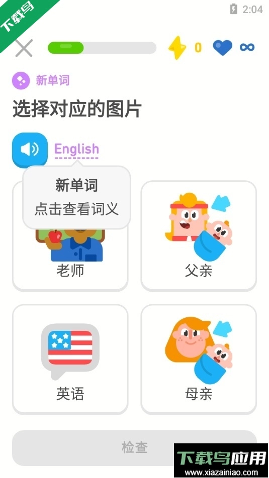 2、完成基础课程的学习,按照系统给出的指导开展单词识别与句子配对练习,借助看图选词、听音辨义等方式来逐步培养初步的语感。