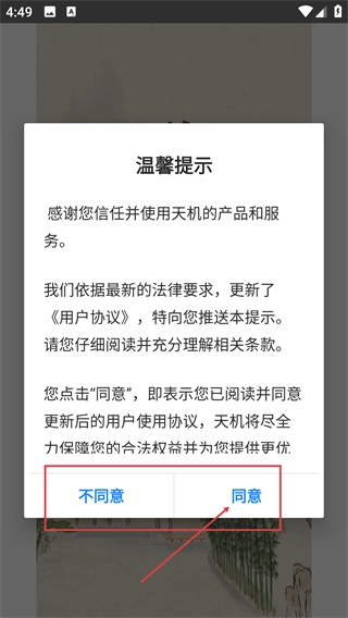 1、在使用服务前,系统会弹出温馨提示,您需要点击【同意】按钮以接受更新后的《用户协议》,完成这一步后才能继续使用天玑的产品与服务。