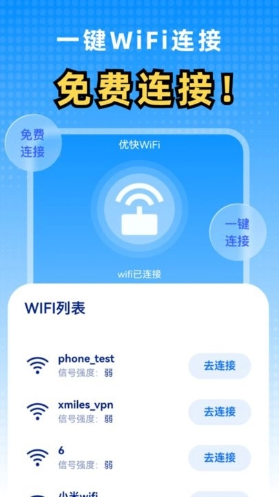 1、用户无需设置和输入复杂密码,就能一键连接周边的安全WiFi网络,就算不清楚具体密码,也能迅速接入网络上网。
