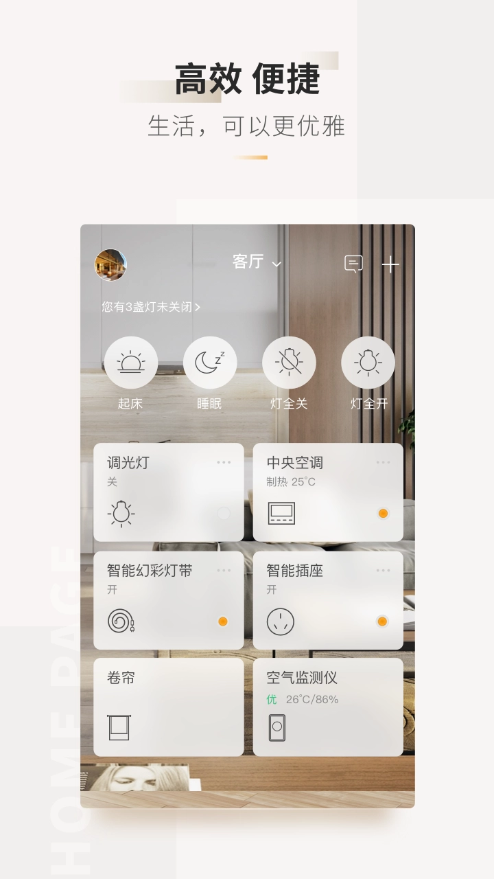 - 远程操控功能,用户借助手机就能不受时间地点限制地管理家中智能设备,轻松掌握家中所有状况。