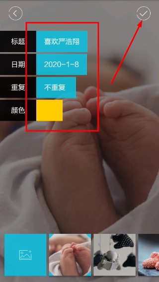 3、进入事件编辑页面后,依次填写标题、日期,设置重复规则并选定颜色,最后点击页面右上角的确认按钮,即可完成事件的创建。