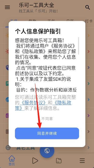进入首页后,需点击“同意并继续”按钮方可开始使用。