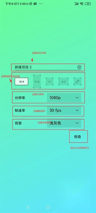 3、可设置项目名称、比例、分辨率、帧率、背景色;