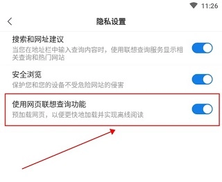5、打开“隐私设置”窗口后,找到并选择“使用网页联想查询功能”这一栏目。