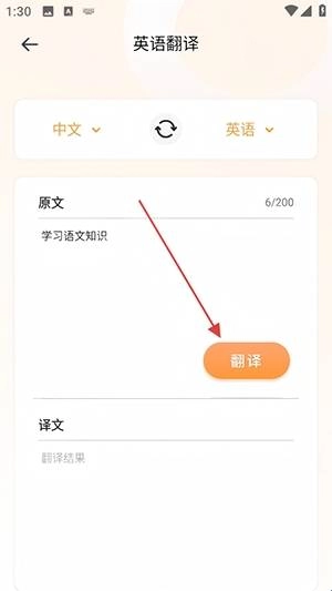 2、在翻译页面中输入中文原文(例如“学习语文知识”),接着点击【翻译】按钮。