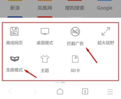 6. 在菜单里向左滑动能看到更多功能选项,像广告拦截以及无痕浏览模式都包含在内。