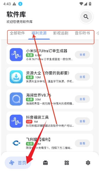 首页呈现了诸多软件分类,像福利软件、影视追剧之类都包含在内。