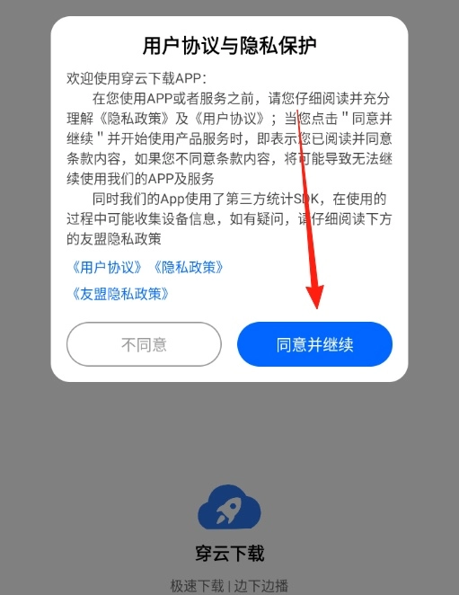 1、打开穿云选择同意并继续