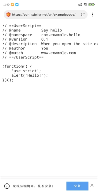 1、在魔趣网下载安装网梭浏览器,之后打开脚本对应的URL链接,由于浏览器会自动识别油猴脚本,届时会弹出安装提示,具体效果可参考下方图示。