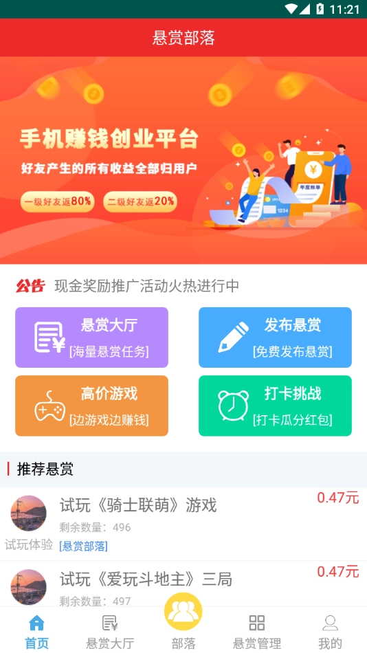 悬赏部落是一款能让用户通过推广任务赚钱的手机应用。平台上有大量的手机赏金任务可供完成,用户参与这些任务就能轻松赚取佣金,感兴趣的伙伴们不妨去体验一番!