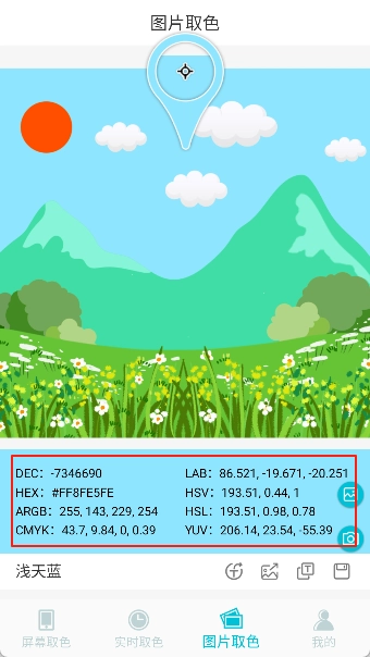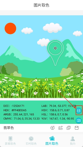 4、上传图片后,点击取色图标,将箭头对准图片中的目标颜色即可完成取色操作。