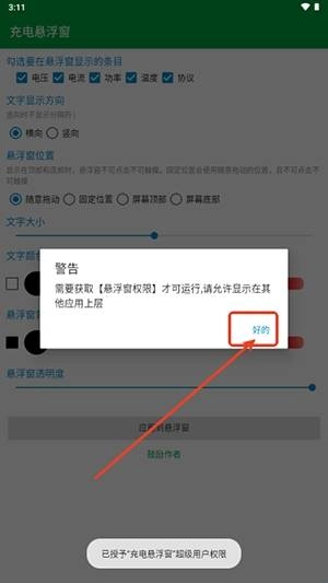 1、打开充电悬浮窗软件后,按提示开启必要权限;