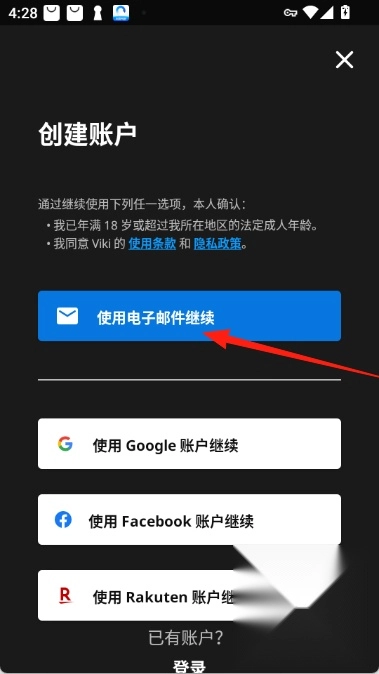 1. 打开viki后,你可以选择用电子邮件、Google、Facebook或Rakuten账户进行登录,也能免费注册一个新账户。