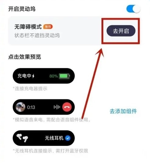 进入小组件详情页,打开“开启灵动坞”开关,然后点击“无障碍模式”右侧“去开启”。