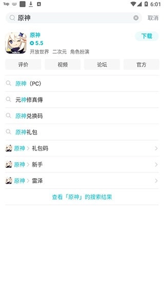 2、点击首页中右上方的搜索标志,输入游戏名称,如原神,该游戏的相关信息就会显示出了。