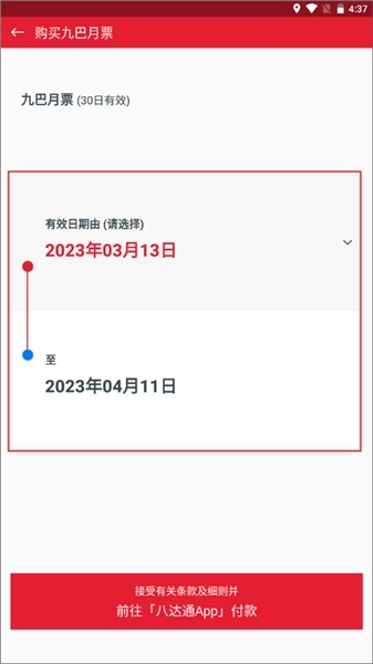 3、选择月票的有效日期,接收有关条款及细则之后,前往八达通进行付款。