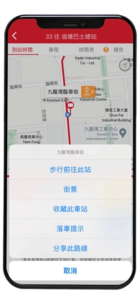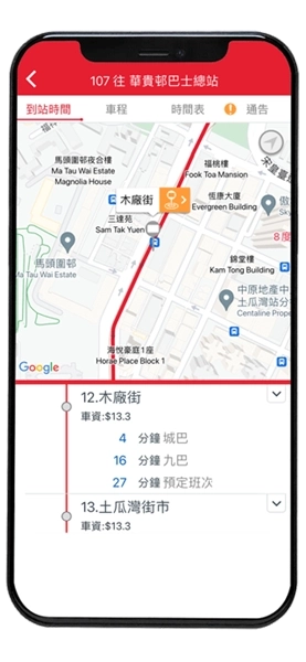 搜寻得到巴士路线结果,除了会列出沿途车站外,另有分页以地图显示巴士线,班次时间表和乘客信息。