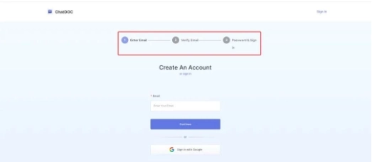 点击左侧的示例文档,就能跳转到对应的文档对话窗口,借此可以简单体验ChatDOC的基本功能。而点击中间的“上传文档”按钮,则会跳转到“Sign in”页面,这意味着需要完成注册才能体验后续的功能。