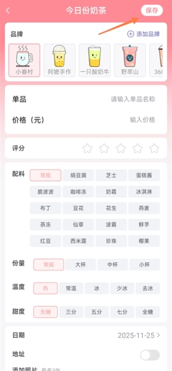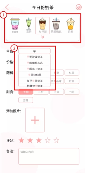 奶茶打卡与记录功能:可以记录每一杯奶茶的品牌、具体单品、消费价格、添加的配料、甜度选择、温度偏好等详细内容,从而生成一份完整的奶茶饮用记录。