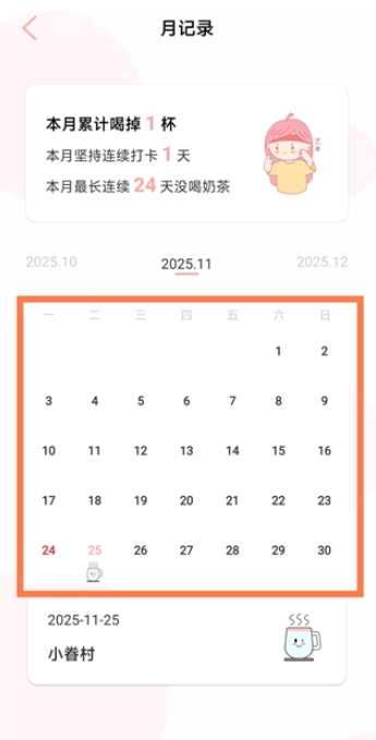 1、打开吨吨奶茶App的【首页】主界面,点击【本月已喝】进入【月记录】界面,在下图框选的内容里找到对应的日期并点击,就能完成补卡操作。