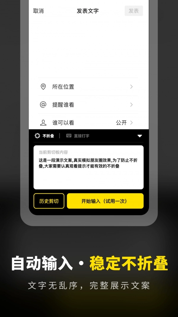 1、朋友圈输入法不折叠、微商输入法、剪贴板输入法、键盘输入法,助力朋友圈长文不折叠——无论是粘贴复制的长文,还是直接发文,都能有效防折叠,让内容完整展示。