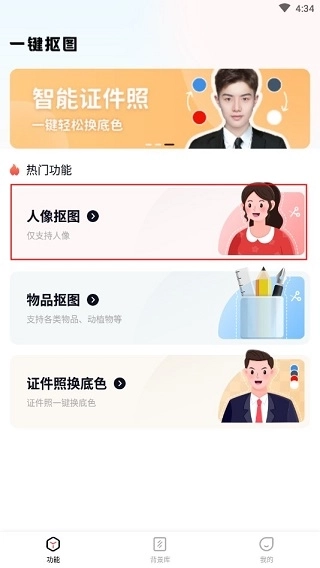 软件功能主要包括人像抠图、物品抠图和证件照换底色