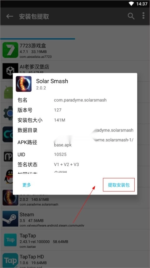 4、点击“提取安装包”按钮,开始提取所选应用或游戏的安装包
