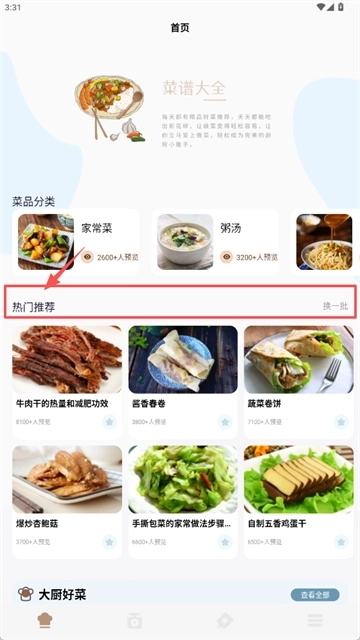 1、进入首页后,即可看到菜谱分类与热门推荐的美食内容,页面底部设有功能导航栏。