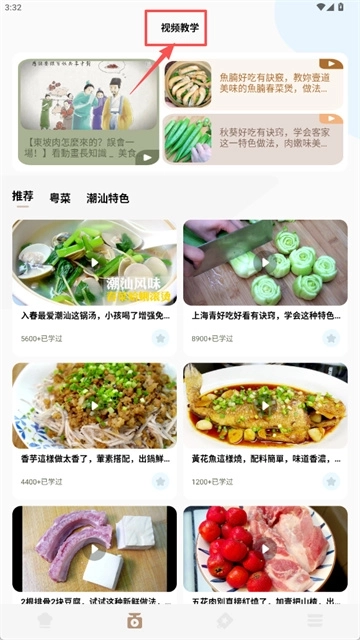 3、点击“视频教学”选项,即可查看视频推荐内容以及菜谱的缩略图,在这些内容的下方还会显示该课程的学习人数。
